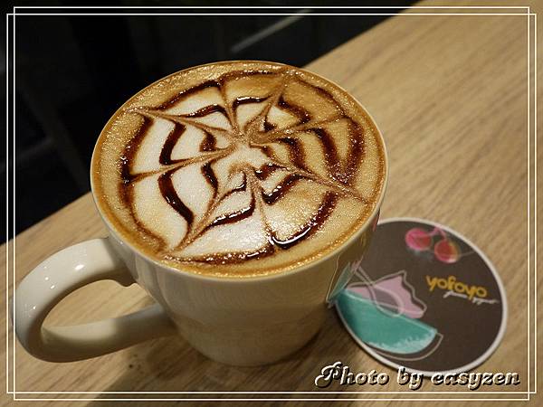 摩卡拿鐵咖啡,上頭有巧克力醬拉花視覺上還蠻不錯,
